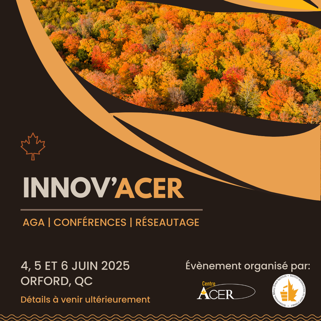 Le Centre ACER et l’Institut International du Sirop d’Érable (IMSI) ont le plaisir de vous inviter à participer à l’évènement Innov’ACER qui se tiendra du 4 au 6 juin 2025, à l’Espace 4 Saisons à Orford.